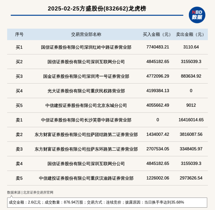 北交所上市公司方盛股份登龙虎榜: 当日换手率达到35.68%